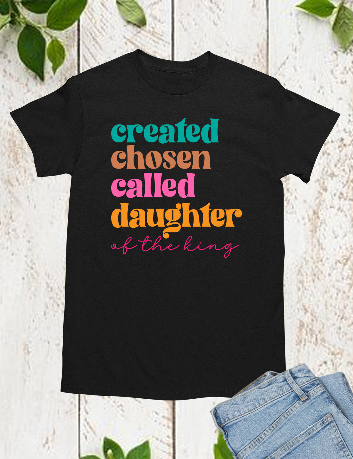 Created Chosen Called Daughter of the King T Shirt is the ultimate addition to any wardrobe. This t-shirt is crafted from the finest grade of cotton, delivering a soft, lightweight, and comfortable feel. Its classic design features a crew neckline, short sleeves, and an effortlessly regular fit.