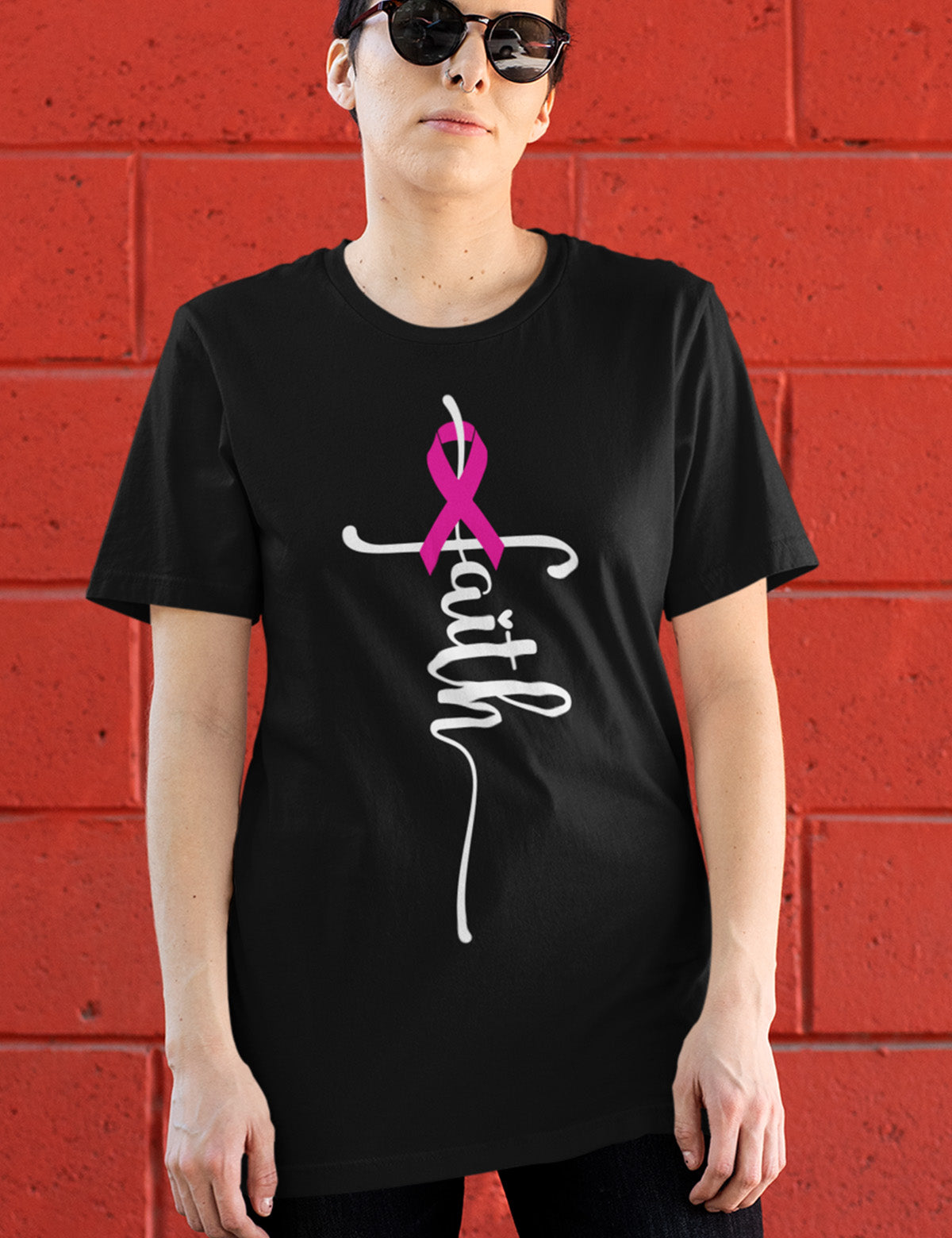 Faith Breast Cancer Shirt is the ultimate addition to any wardrobe. This t-shirt is crafted from the finest grade of cotton, delivering a soft, lightweight, and comfortable feel. Its classic design features a crew neckline, short sleeves, and an effortlessly regular fit.