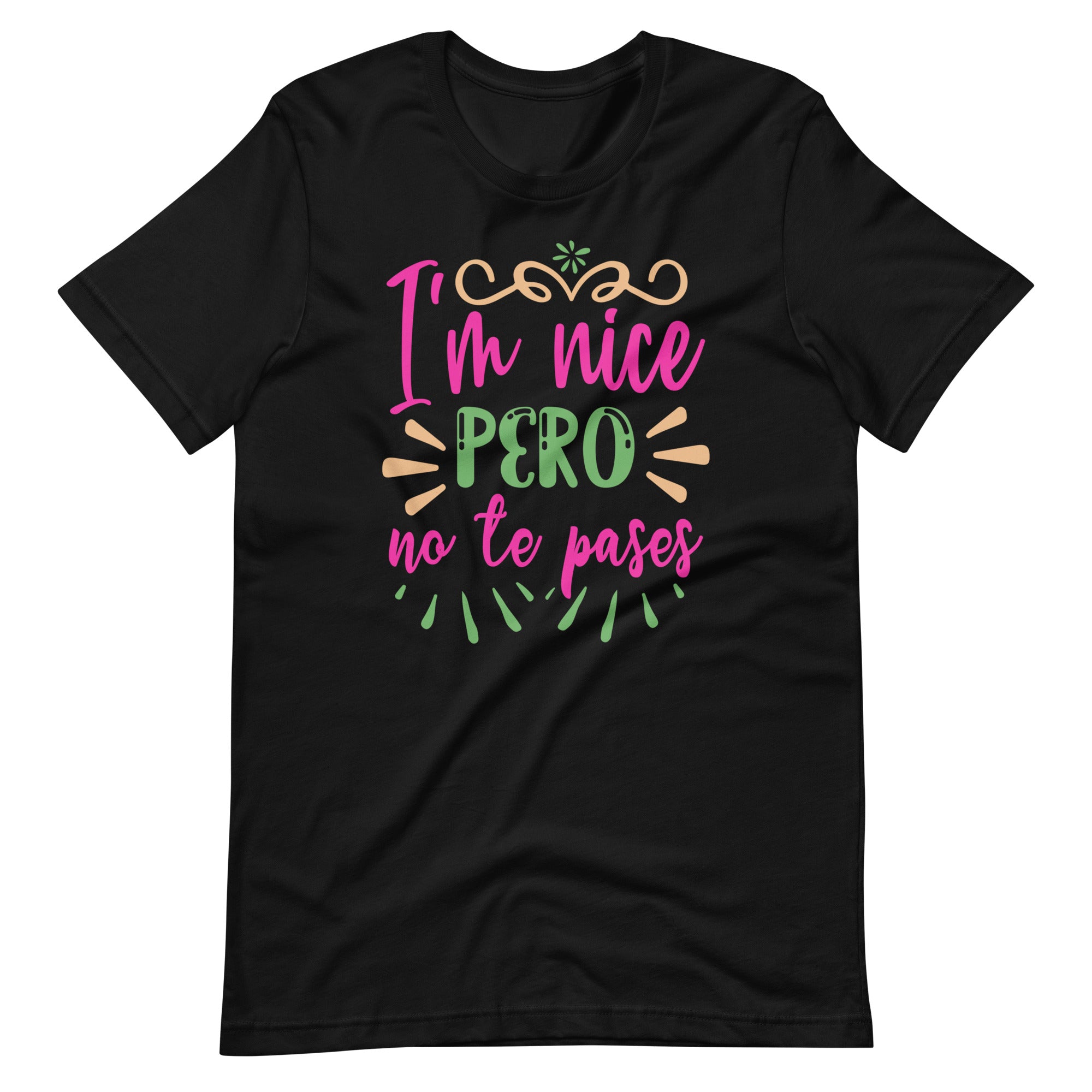 I'm Nice Pero No Te Pases Latina T-shirt is the ultimate addition to any wardrobe. This t-shirt is crafted from the finest grade of cotton, delivering a soft, lightweight, and comfortable feel. Its classic design features a crew neckline, short sleeves, and an effortlessly regular fit.