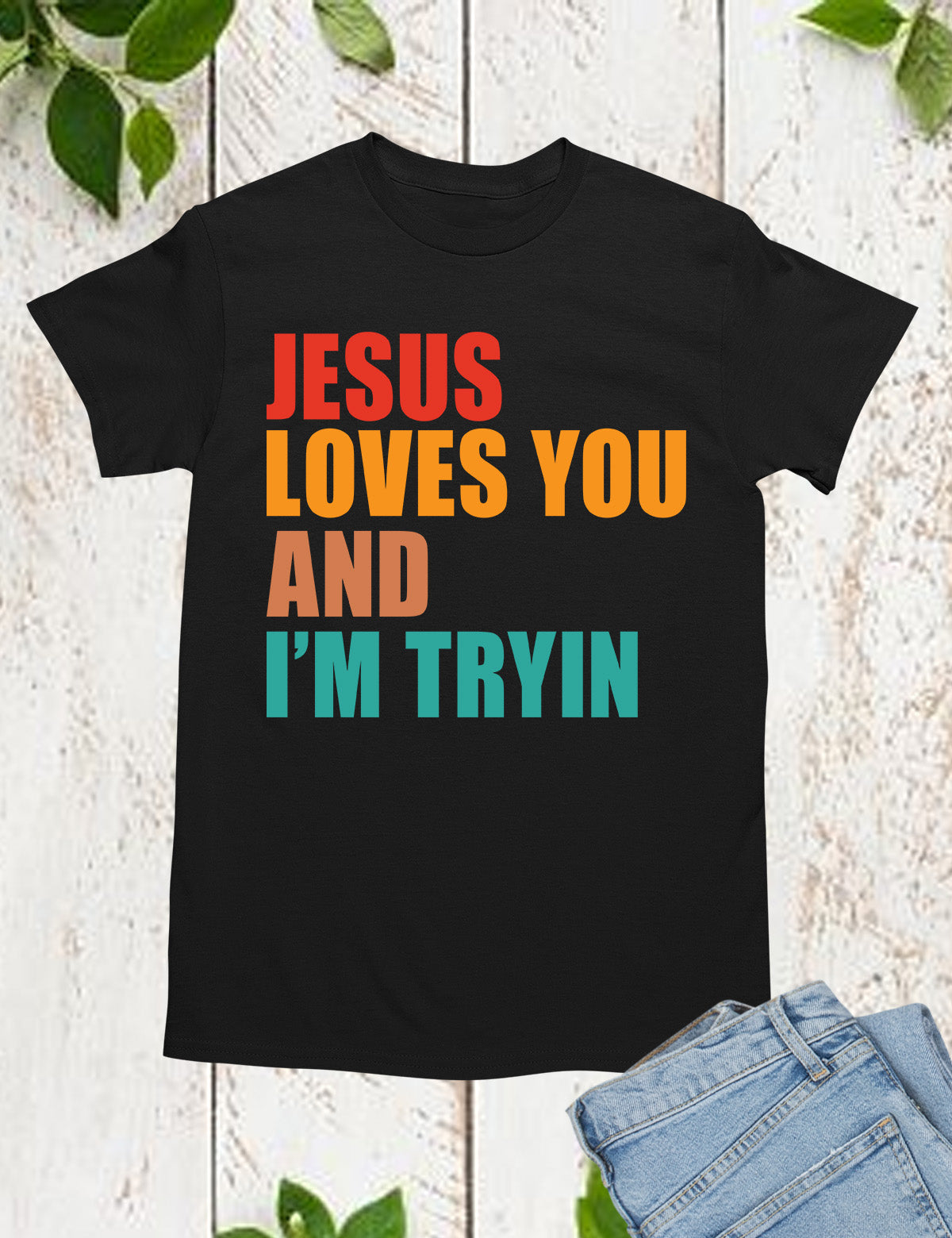 Jesus Loves You I'm Tryin Christian T Shirt is the ultimate addition to any wardrobe. This t-shirt is crafted from the finest grade of cotton, delivering a soft, lightweight, and comfortable feel. Its classic design features a crew neckline, short sleeves, and an effortlessly regular fit.