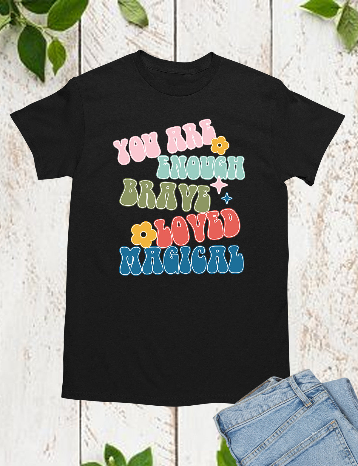 You are Enough Brave Loved Magical shirts is the ultimate addition to any wardrobe. This t-shirt is crafted from the finest grade of cotton, delivering a soft, lightweight, and comfortable feel. Its classic design features a crew neckline, short sleeves, and an effortlessly regular fit.